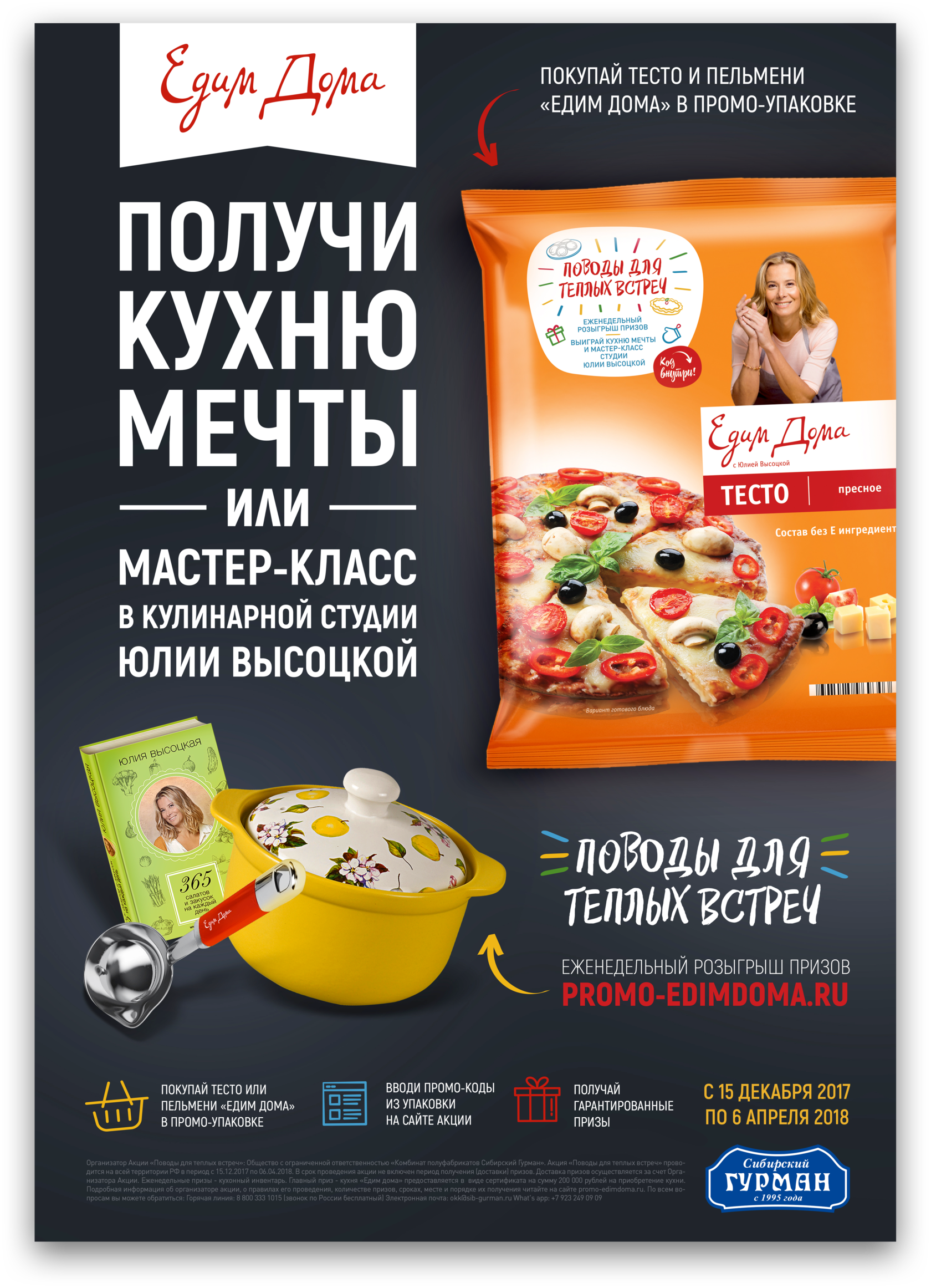 «Едим дома» – это бренд Юлии Высоцкой, предлагающий большой ассортимент товаров для кулинарии от рецептов до кухонной утвари и даже кухонной мебели.
