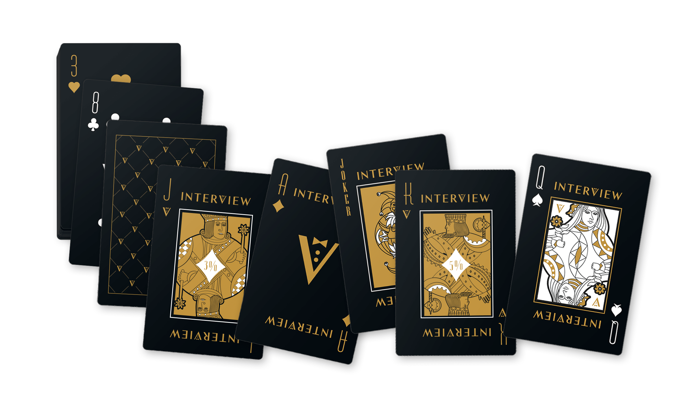Для названия Interview разработан индивидуальный шрифт. Буква V может использоваться отдельно, как стилеобразующий элемент.