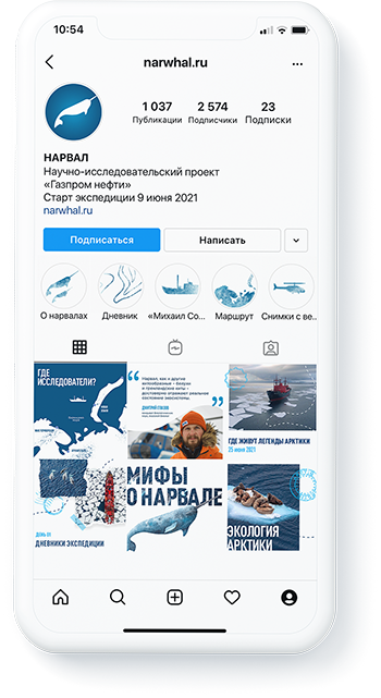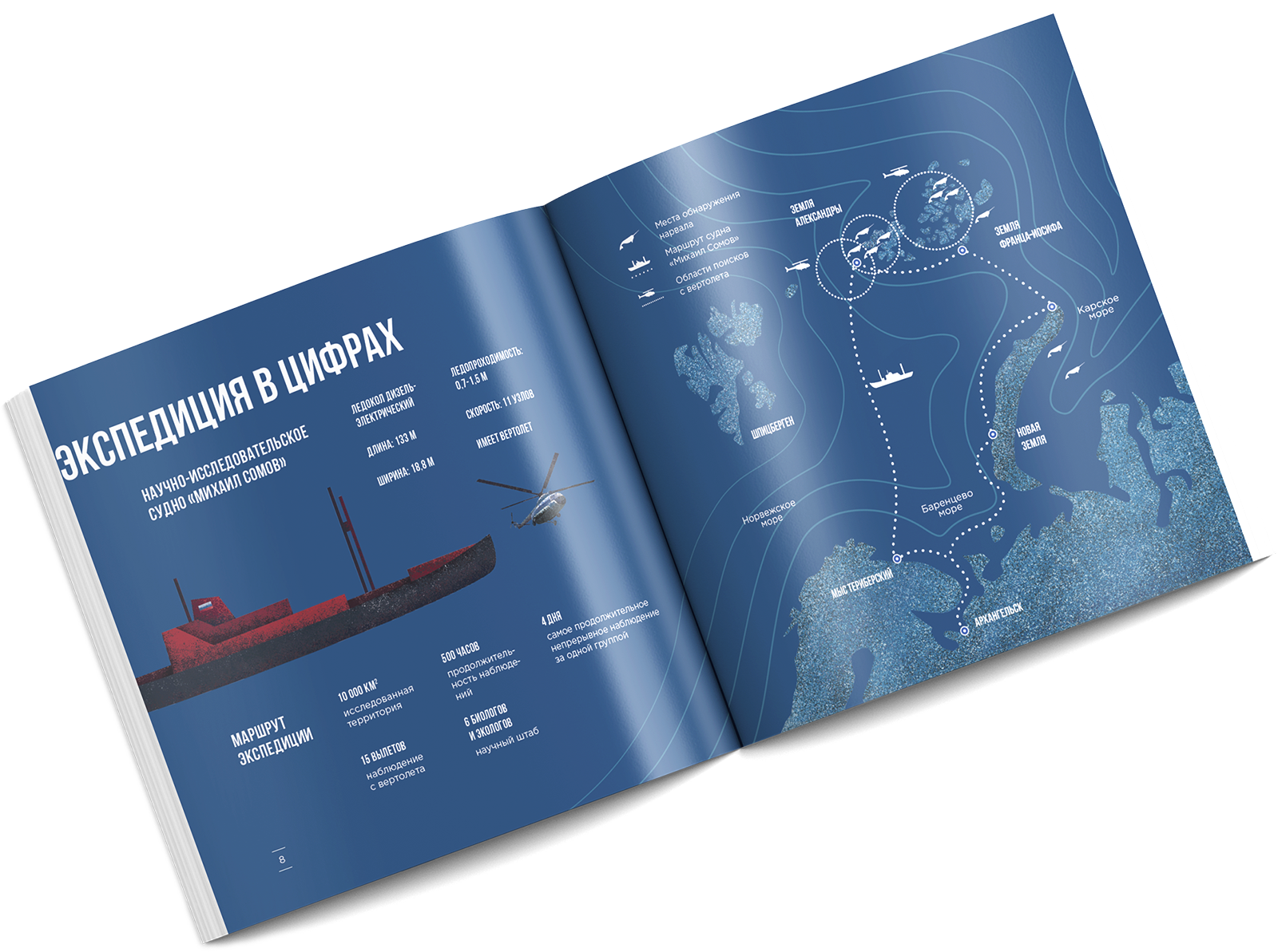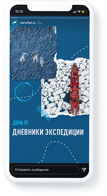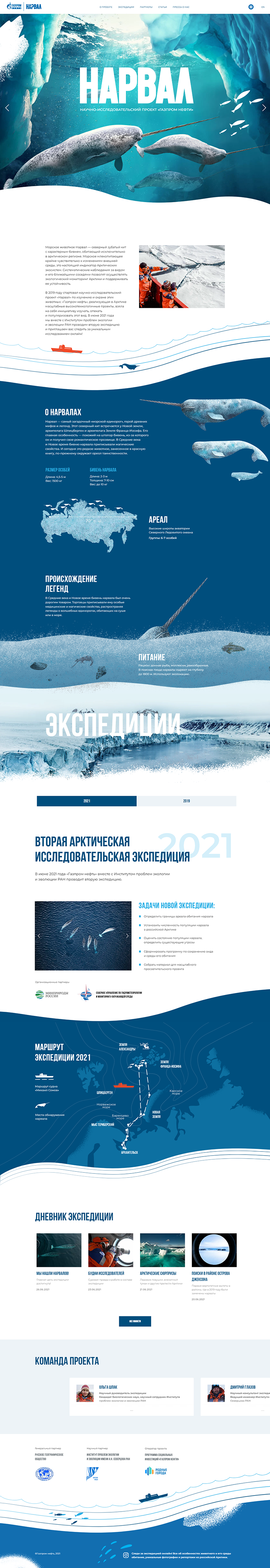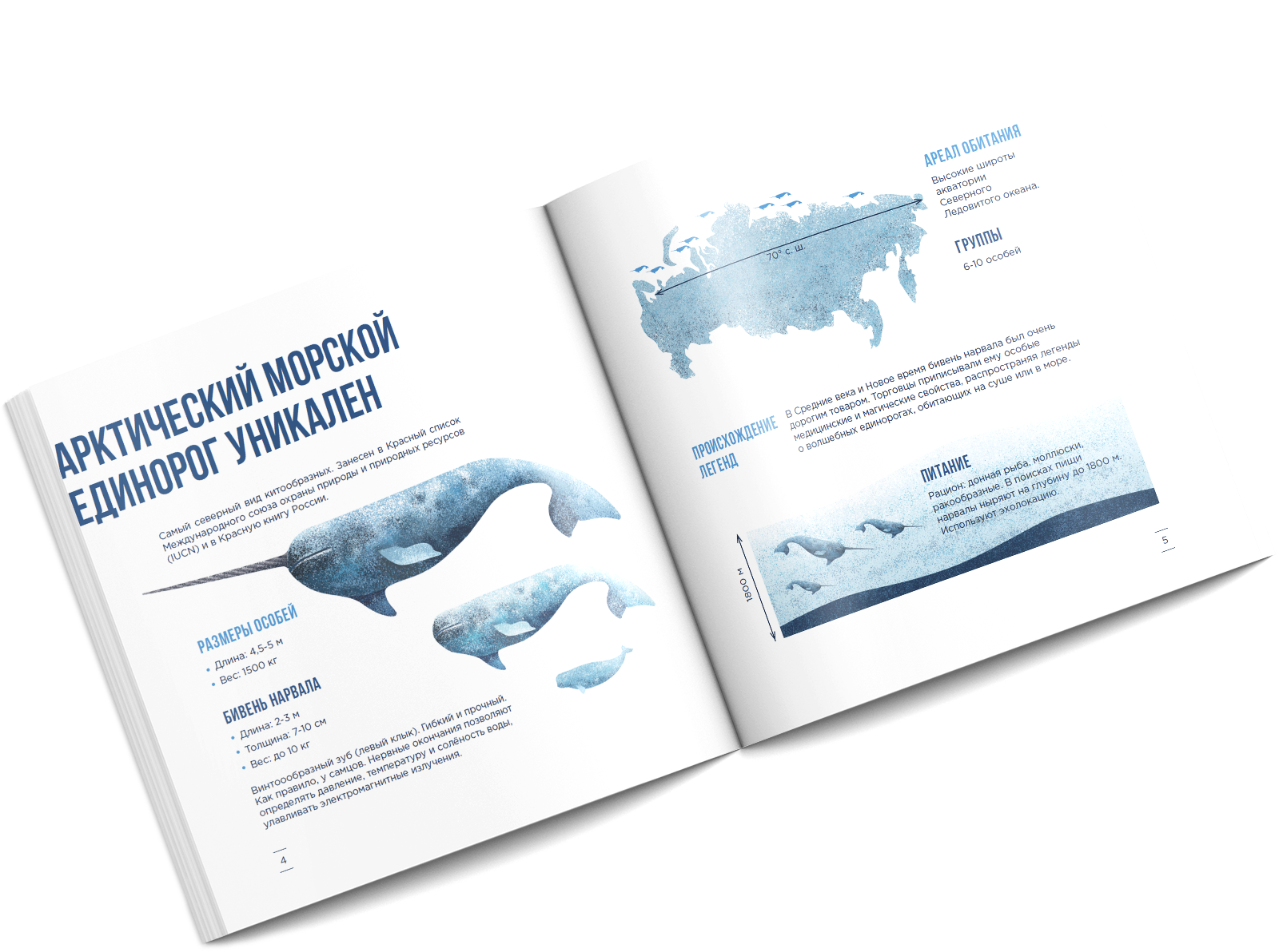 Создание сайта, оформление соц. сетей и разработка буклета для транслирования информации о нарвалах, публикации маршрута экспедиции и новостей от участников экспедиции. Разработка графических иллюстраций с изображением нарвалов, отрисовка карт маршрутов экспедиций и разработка инфографики о нарвалах.