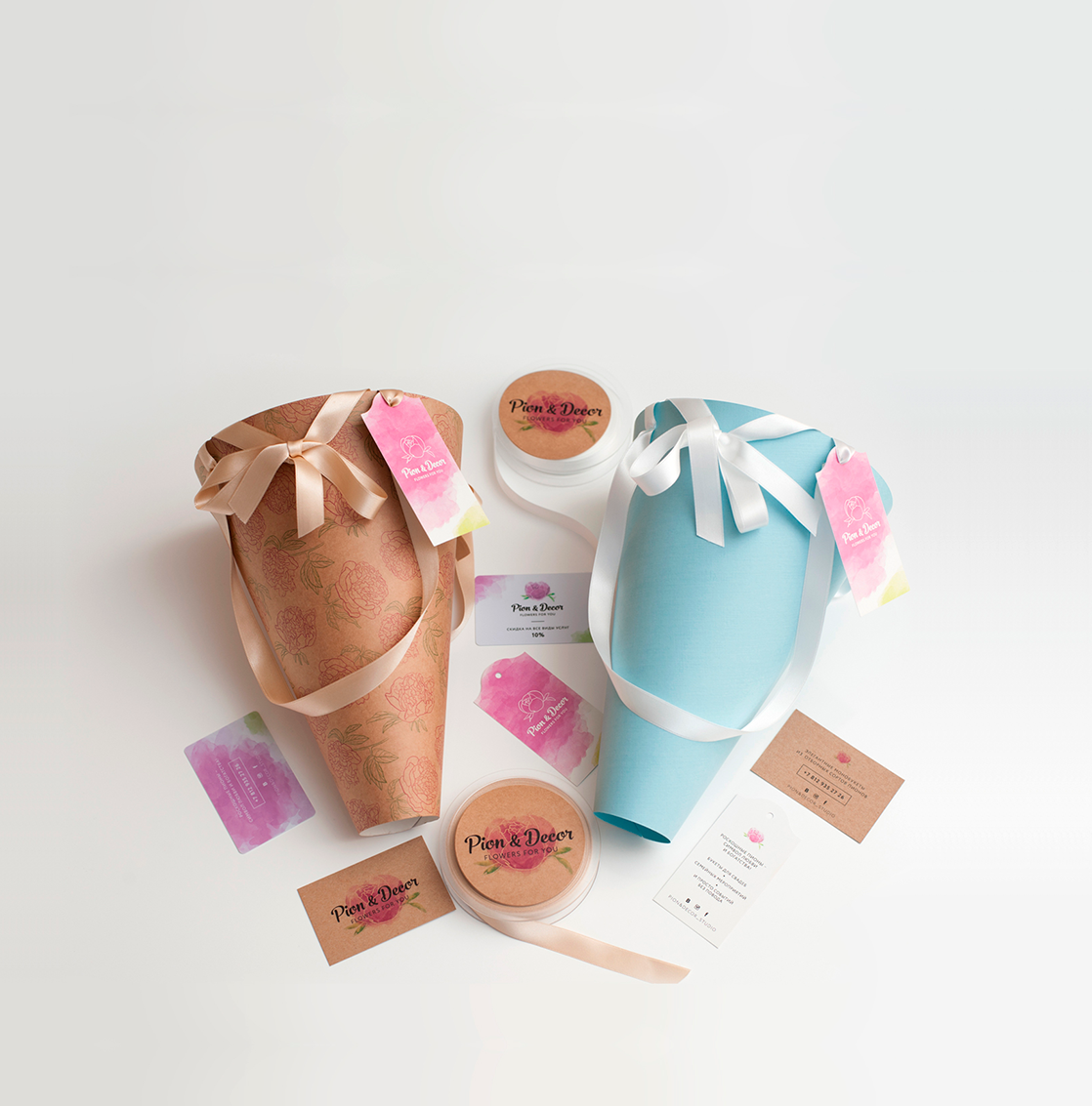 Студия Pion & Decor поставила перед нами задачу создать логотип и фирменный стиль для своего бренда. Для цветов была создана уникальная упаковка, выделяющая студию среди конкурентов.