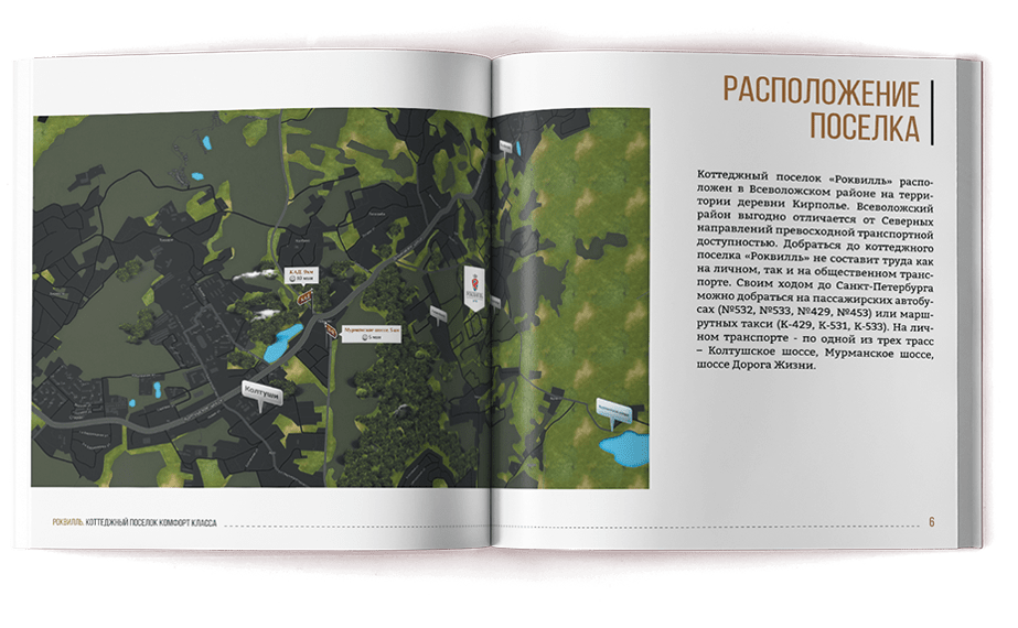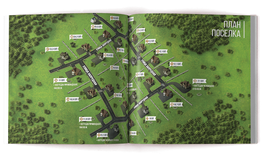 Разработать брендинг, полиграфию, рекламные билборды и презентационный сайт. Для сайта нарисовать подробный план застройки с описанием каждого из коттеджей.