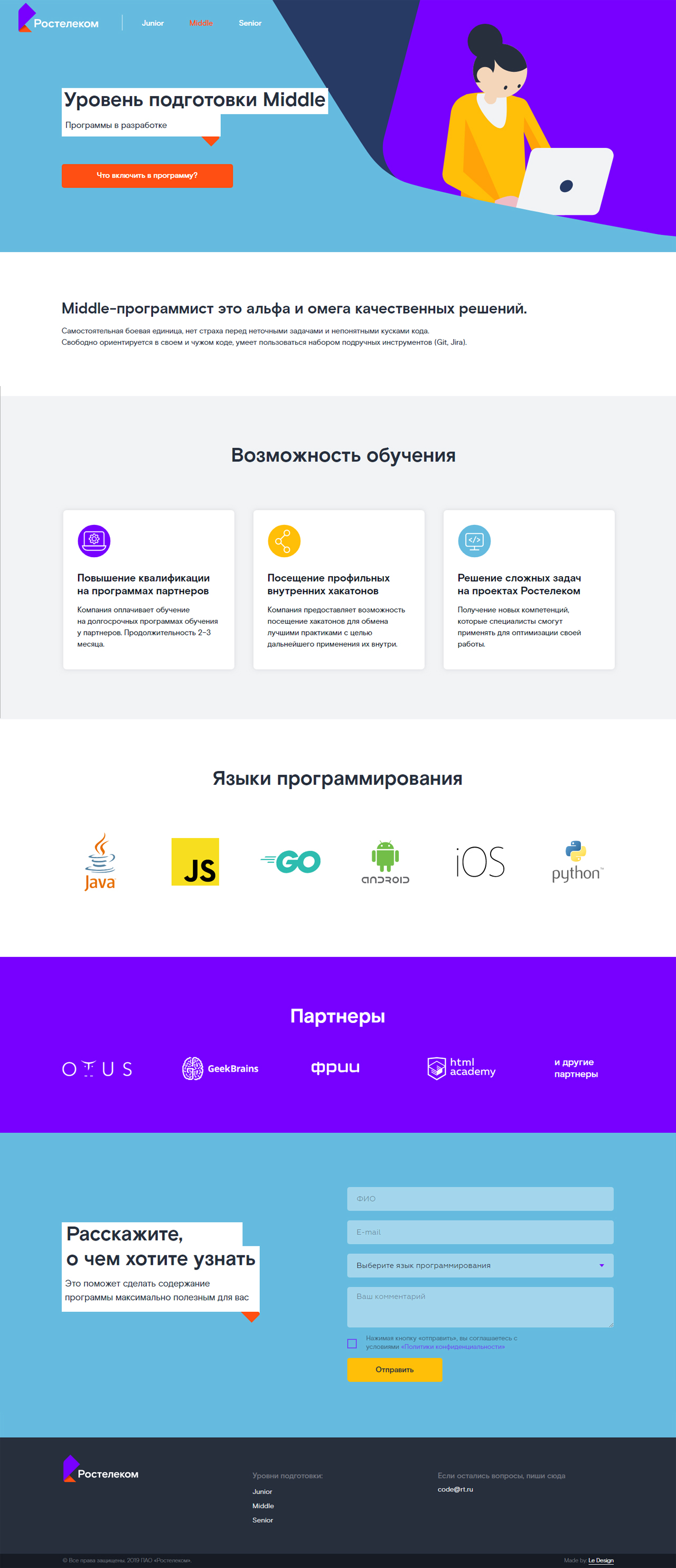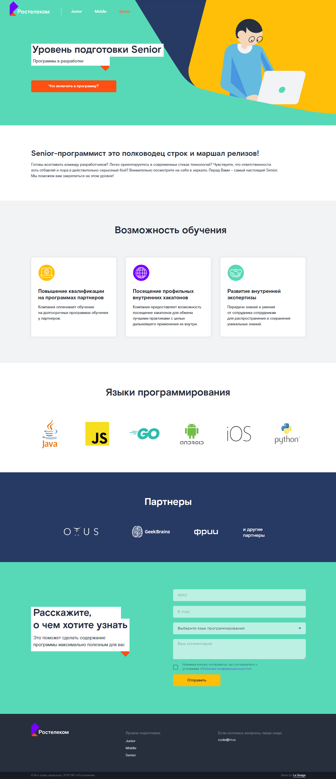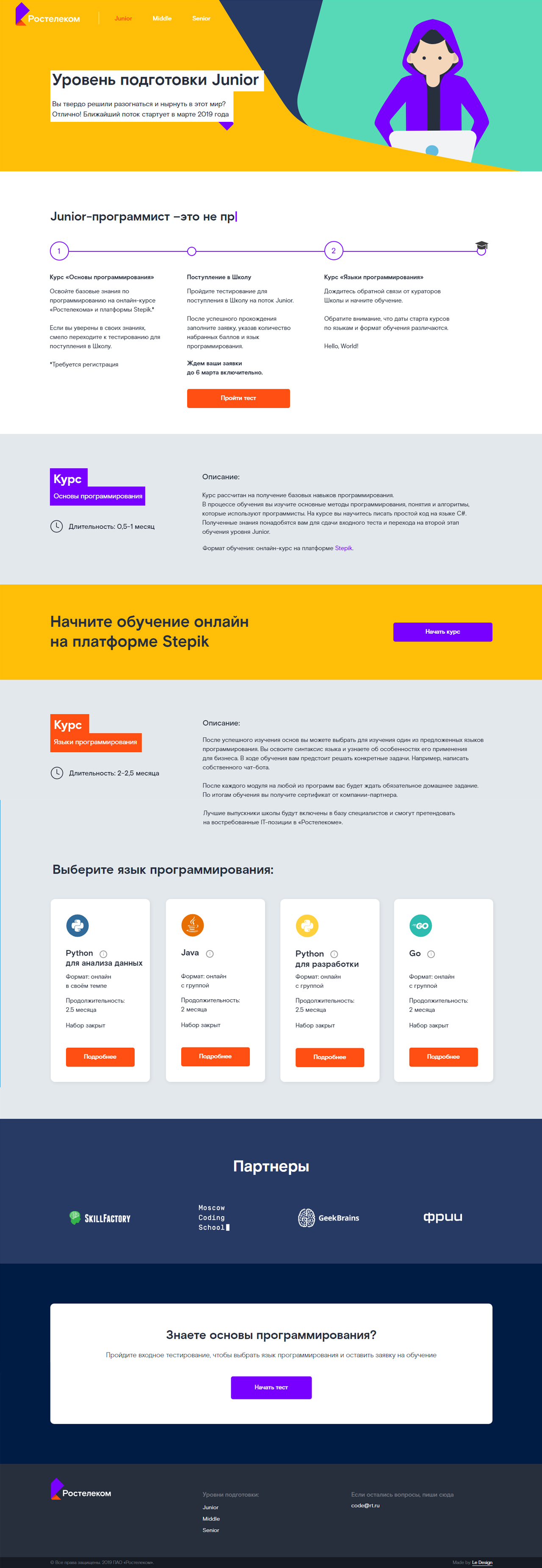 Школа программирования Ростелекома — это внутреннее направление, где сотрудники компании могут переквалифицироваться и обучиться новой профессии. Для определения уровня знаний по программированию можно прямо на сайте пройти тест и оставить заявку на обучение.