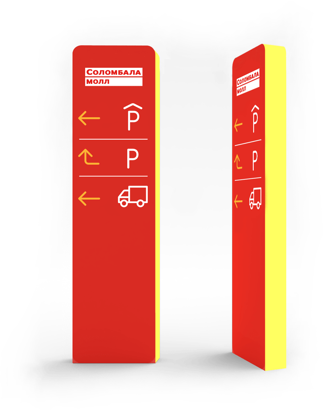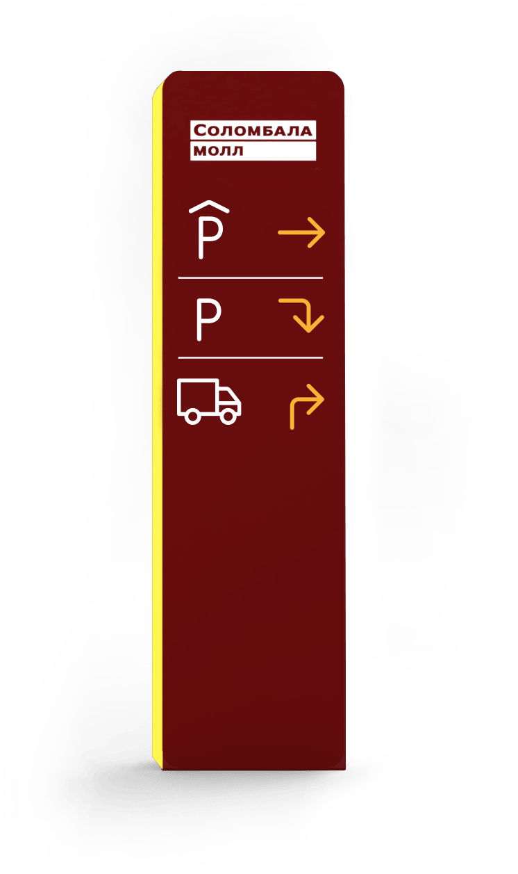 Для разделения потока машин, приезжающих в торговый центр, нами был разработан указатель, помогающий понять, в каком направлении находятся наземная и подземная парковки и зона разгузки машин.