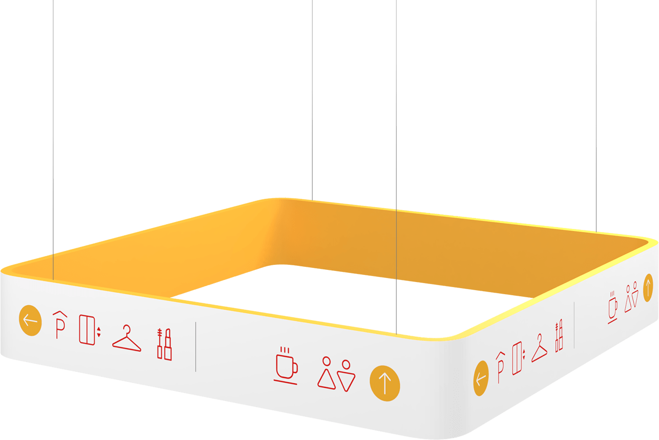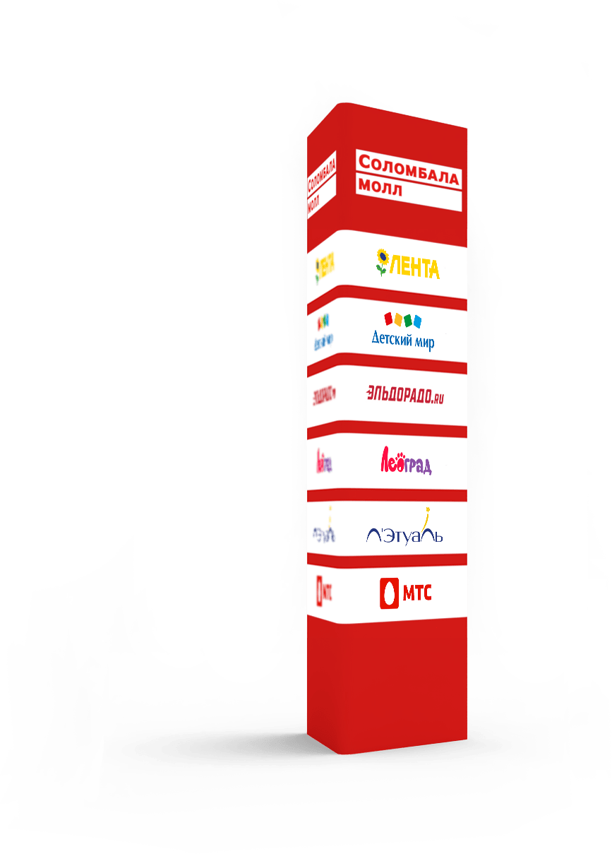 Торговый центр Соломбала Молл имеет необычную систему сквозных галерей, а визуально он поделен на две части и имеет коридоры разной ширины. Мы разработали конструкции типа «Куб», которые помогают покупателям сориентироваться, что находится в каждом из четырех направлений.