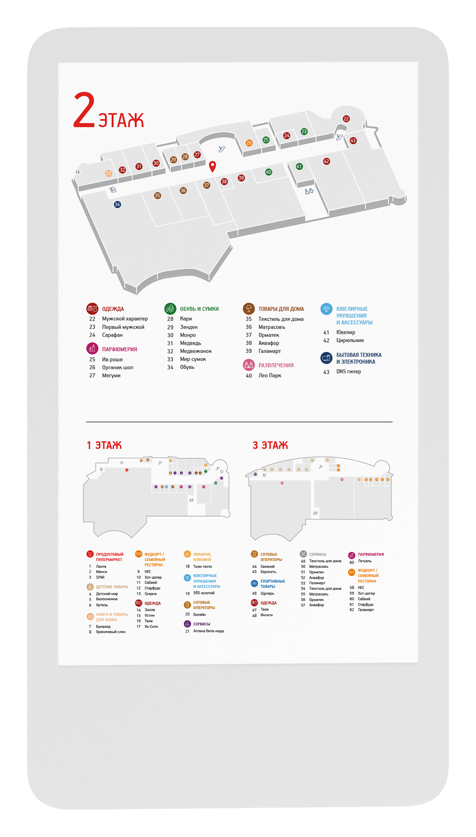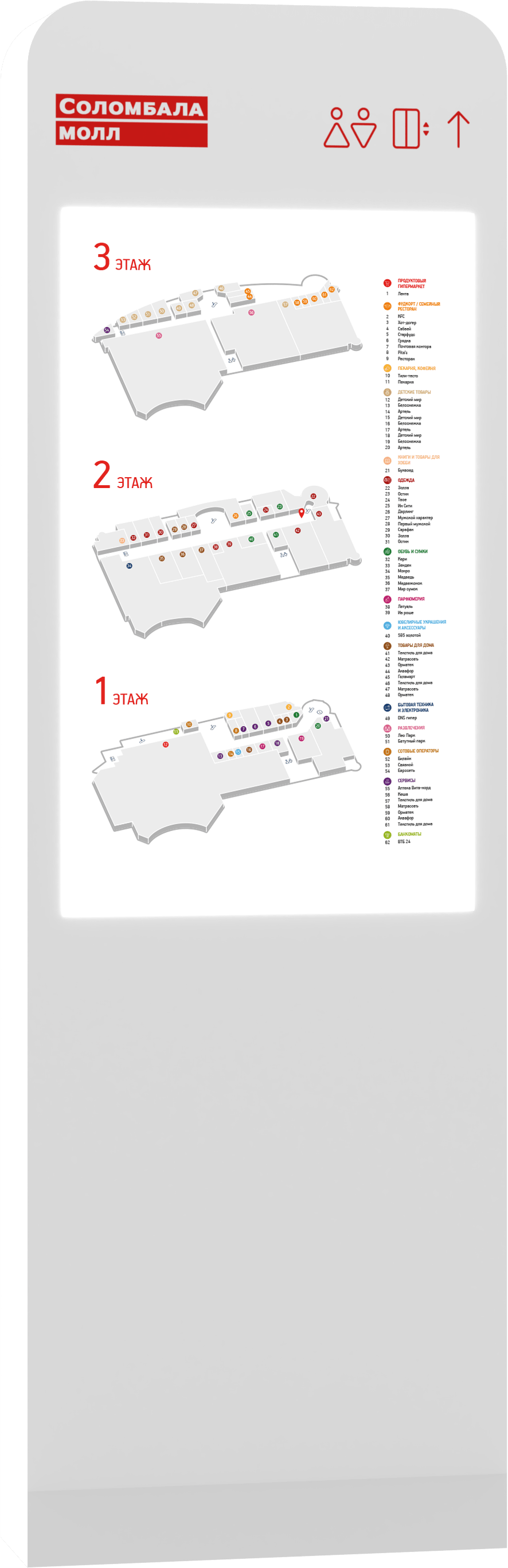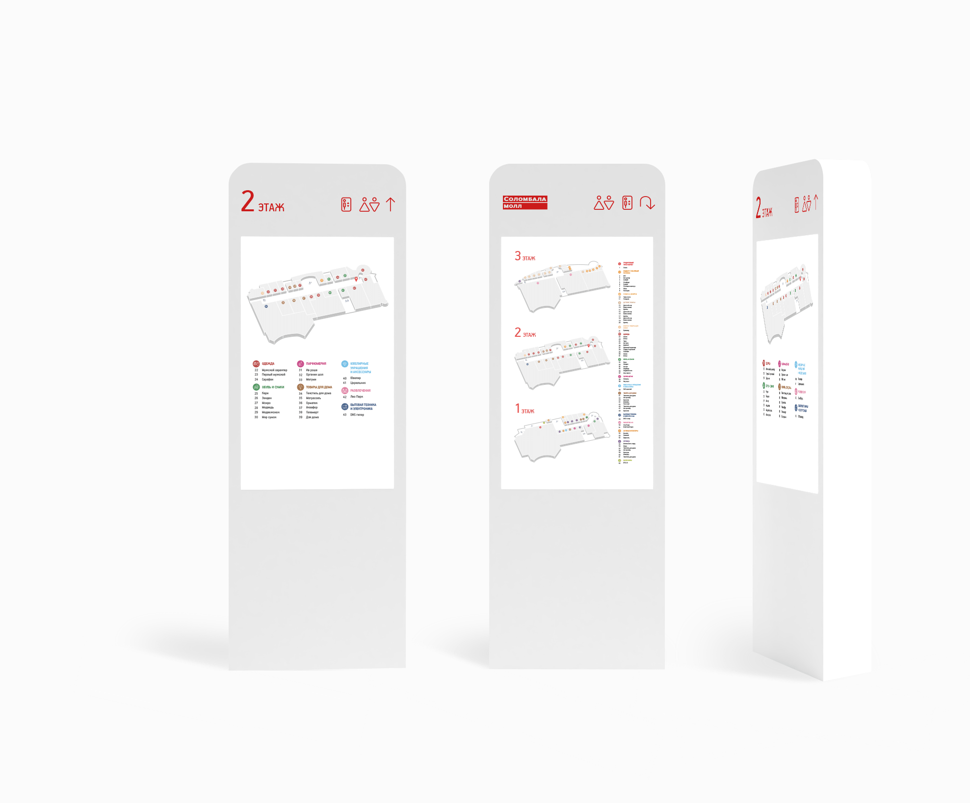 Для удобной навигации по торговому центру мы ввели цветовое кодирование по этажам в рамках фирменных цветов Соломбала Молл. Яркие цвета помогают привлечь внимание посетителей.