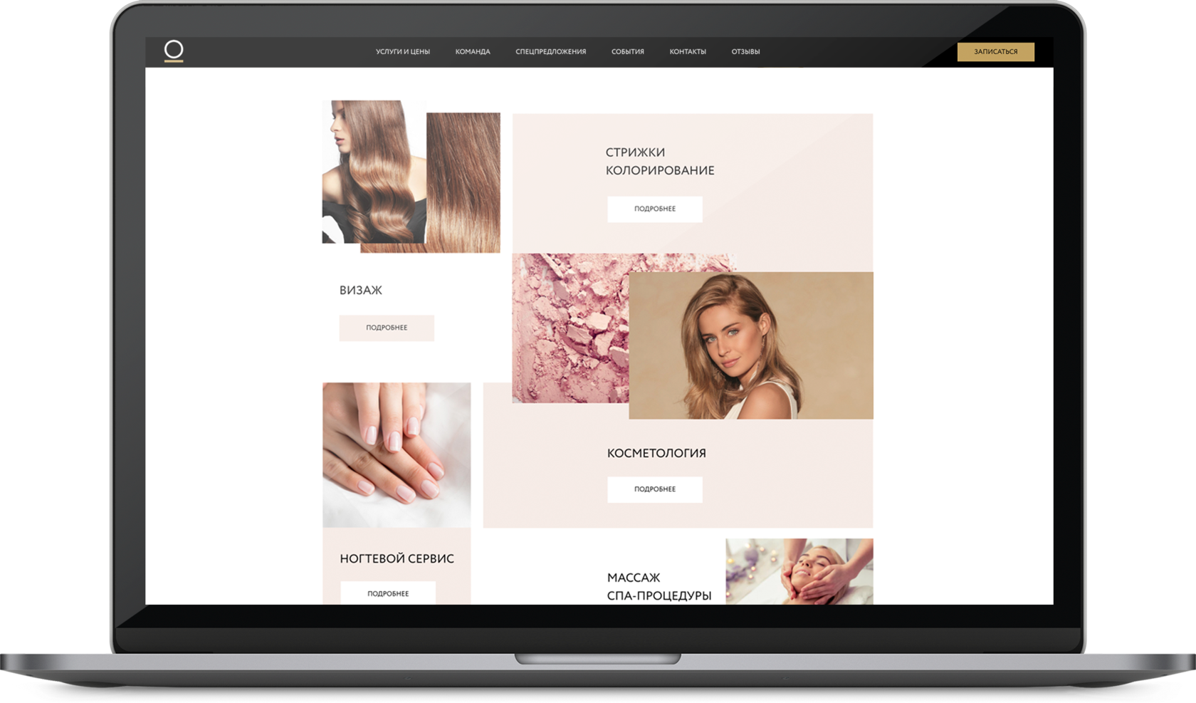 Создать сайт салона красоты на конструкторе Tilda с возможностью просмотра услуг и записи к необходимому специалисту. Поддержать заданную стилистику французского бренда, но адаптировать под салон российский бренд.