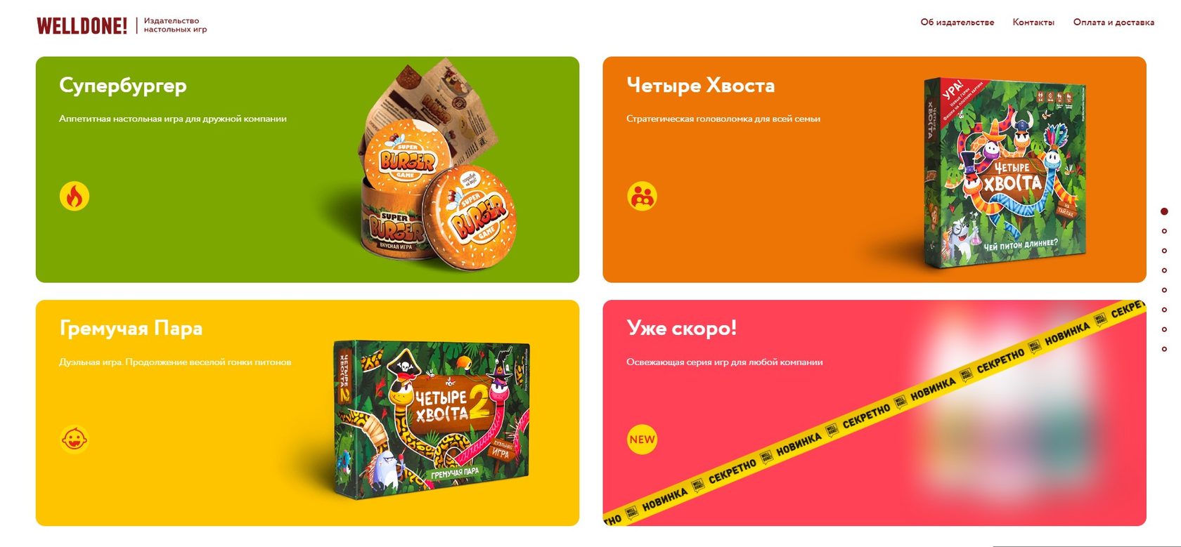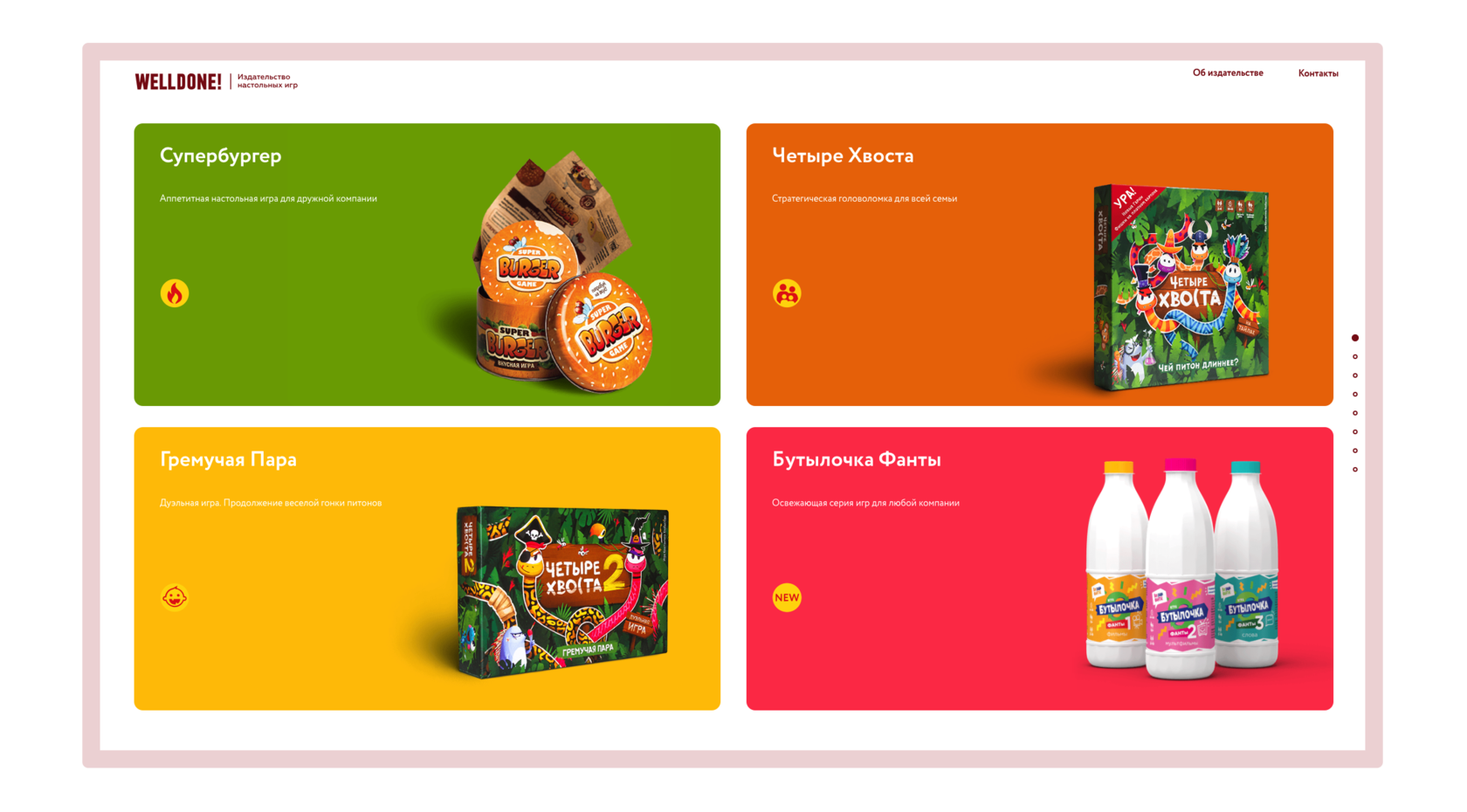 Welldone — молодое независимое издательство, создающее увлекательные настольные игры. Весь цикл создания игр: разработка сценариев, прорисовка персонажей, изготовление и упаковка происходят внутри издательства и являются авторской работой.
